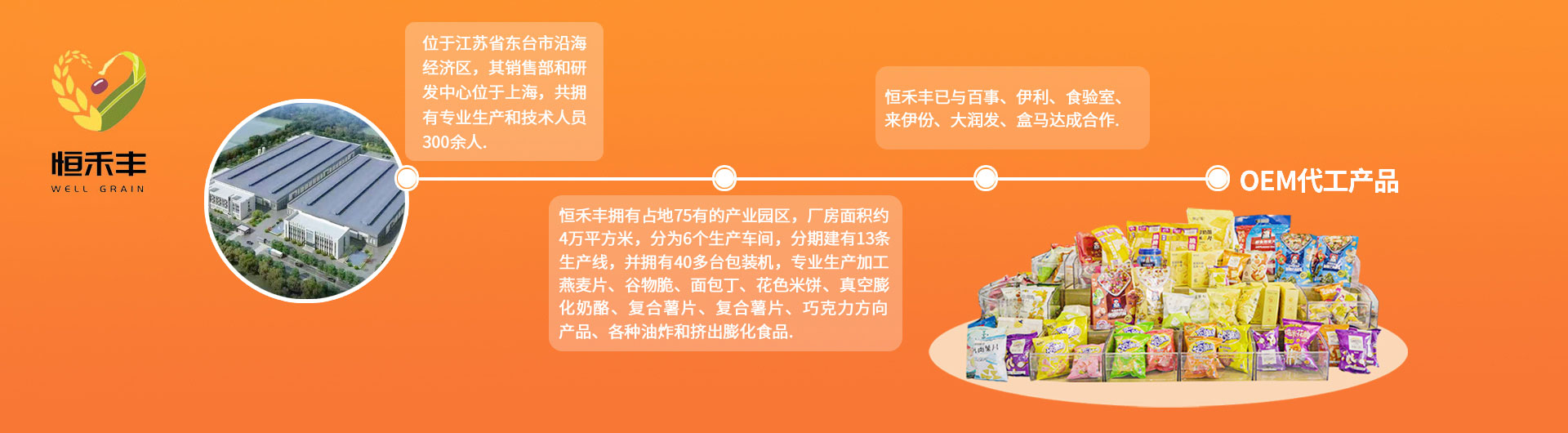 目前,恒禾豐擁有占地75畝的產業(yè)園區(qū),廠房面積約4萬平方米,分為6個生產車間,分期建有13條生產線,并擁有40多臺包裝機,專業(yè)生產加工燕麥片、谷物脆、面包丁、花色米餅、低溫真空膨化奶酪及果蔬、各種油炸和擠出膨化食品。